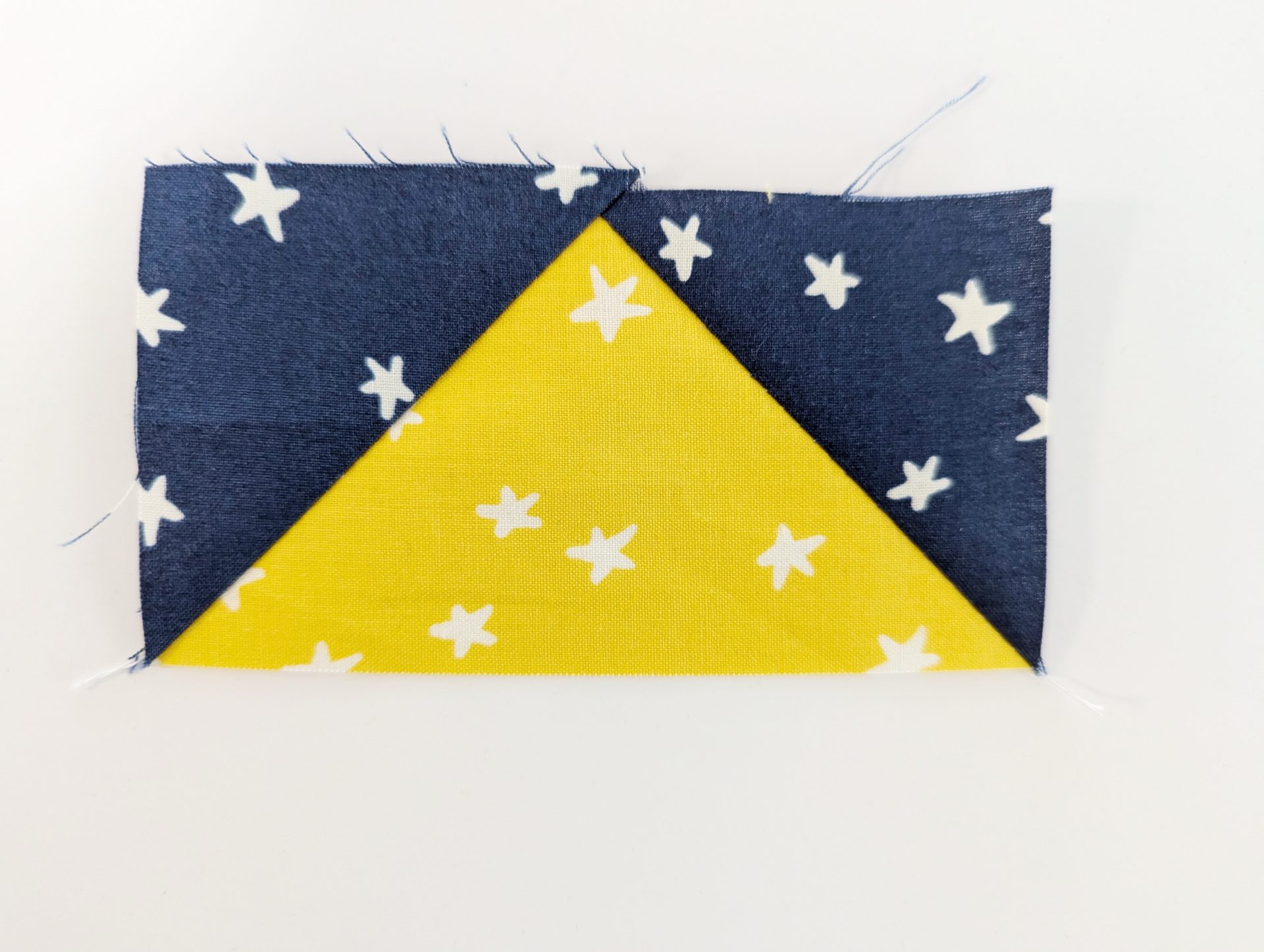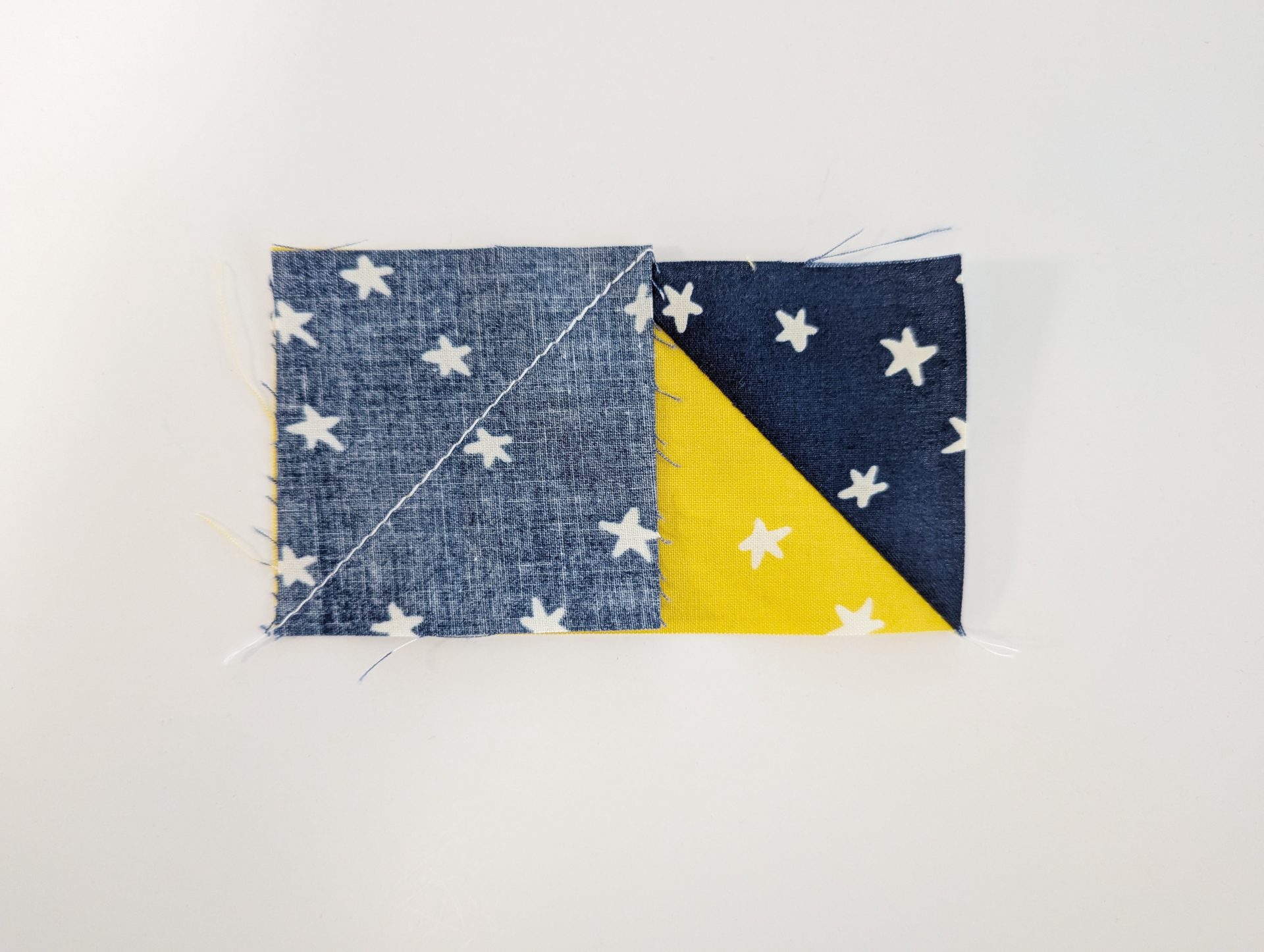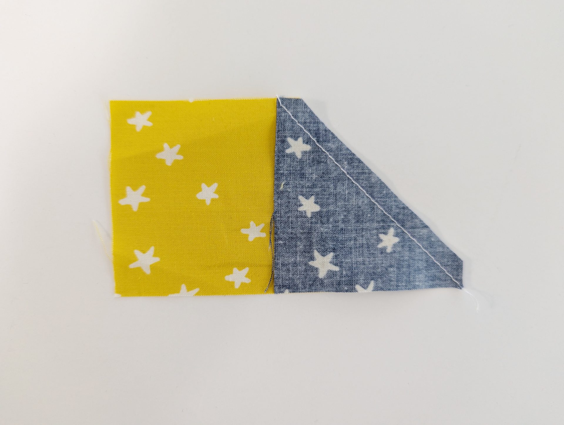 - Sew directly on the drawn line, then trim ¼” away from the seam. Press toward the square to reveal the first half of your Flying Geese.