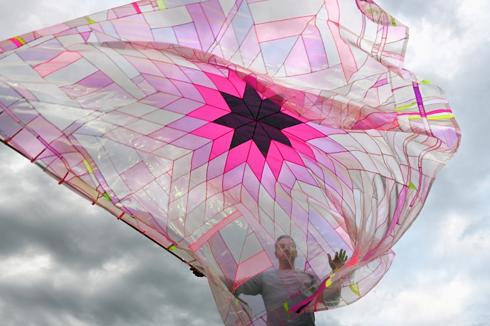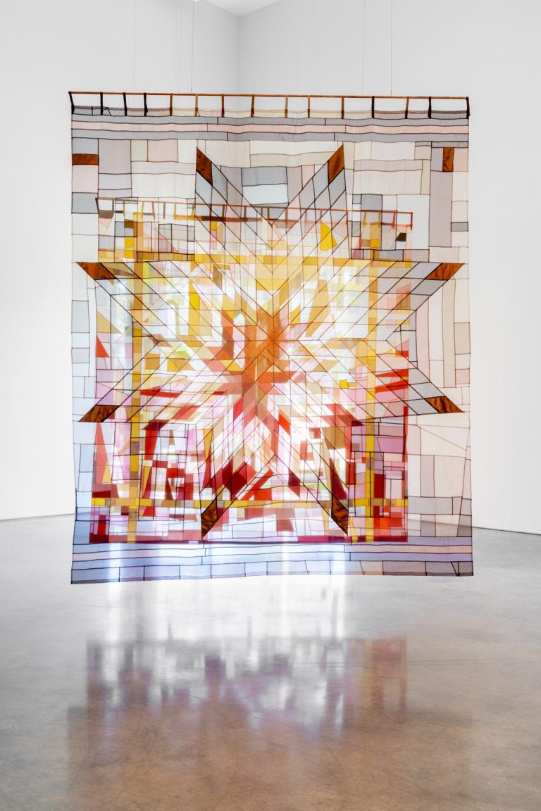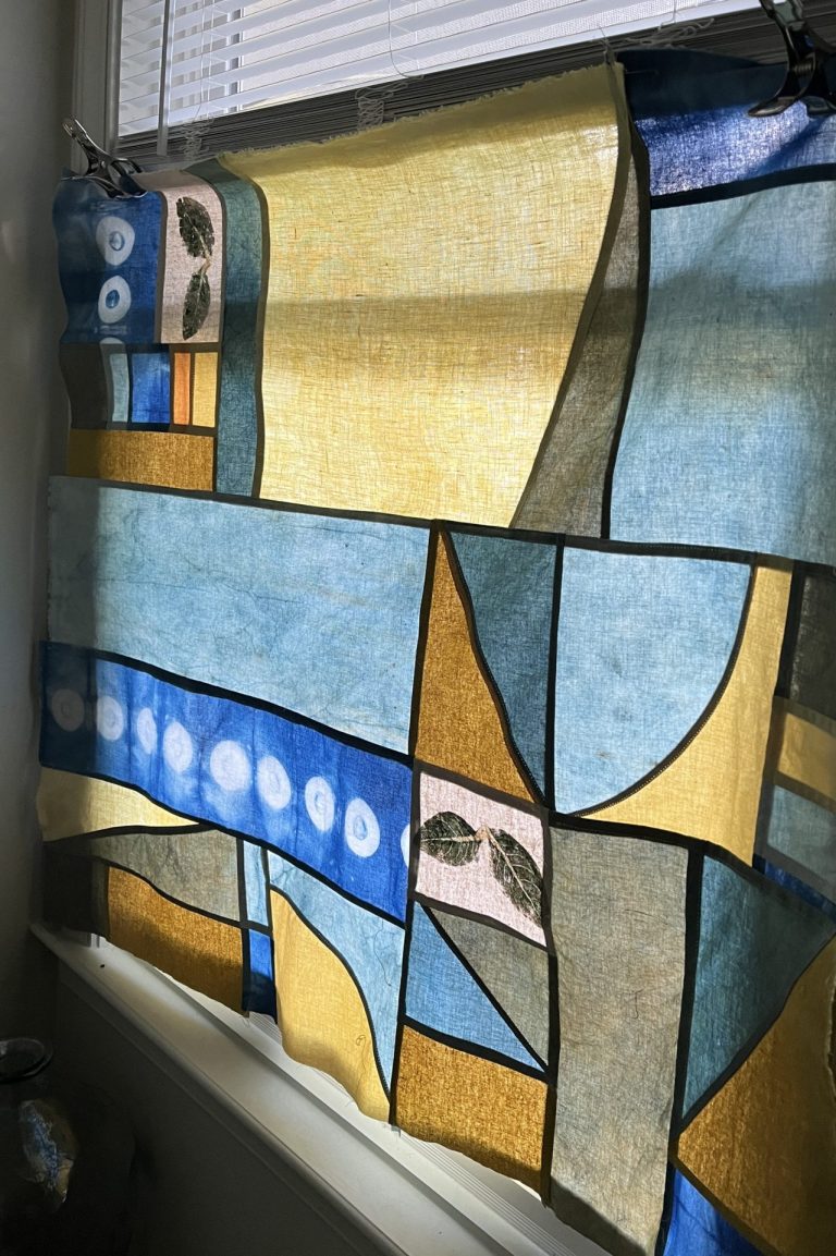 To explore the beauty of transparency in quilting, we can look to the artwork of Wally Dion, a contemporary artist who masterfully layers color and form to create glowing, almost stained-glass-like effects. His pieces, often created with recycled materials and painted surfaces, give the illusion of overlapping light and shadow, where shapes appear to float over one another.