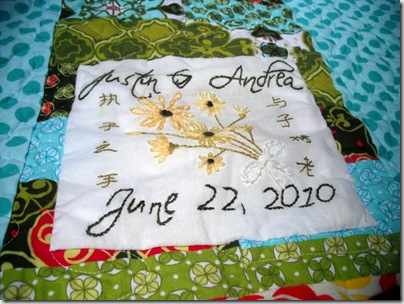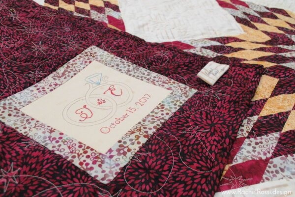 This quilt made by Rachel Rossi is such a lovely tribrute to the happy couple not only is it a beautiful heirloom piece, the emboirdered label adds a touch of personal charm. Check out more about her quilt here.