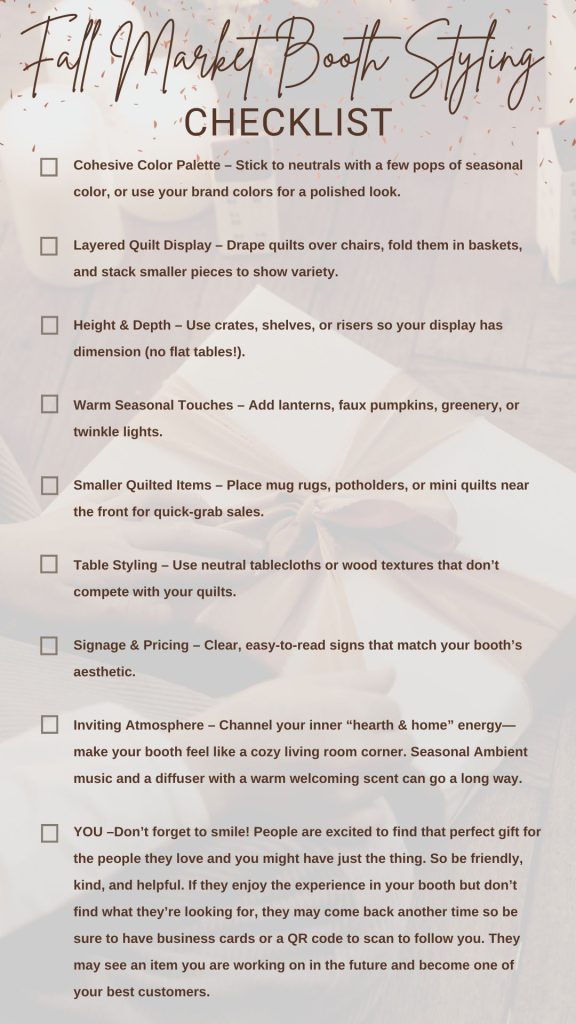 Selling quilts isn’t just about the product—it’s about the experience. A booth that feels warm and inviting will attract more people to stop, browse, and (fingers crossed) buy.