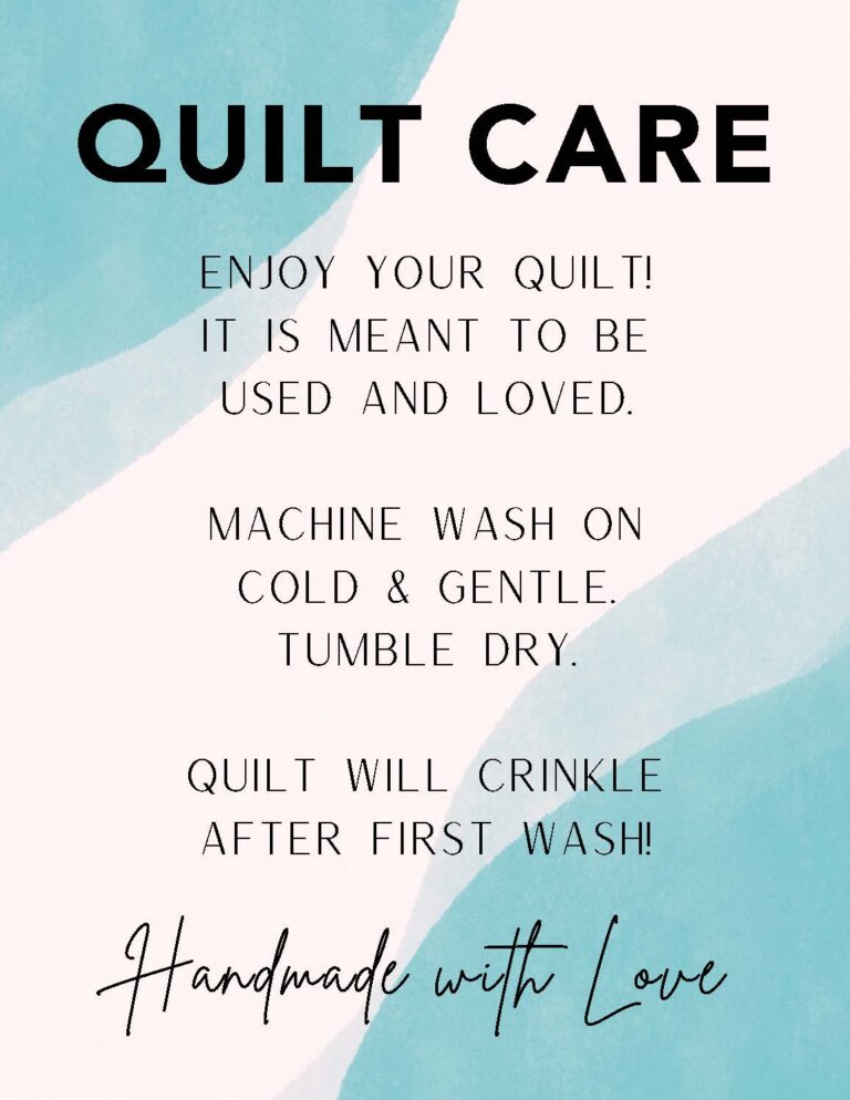 To help others care for quilts, include a care tag with your creations. Here’s a simple template you can stitch or print onto fabric: