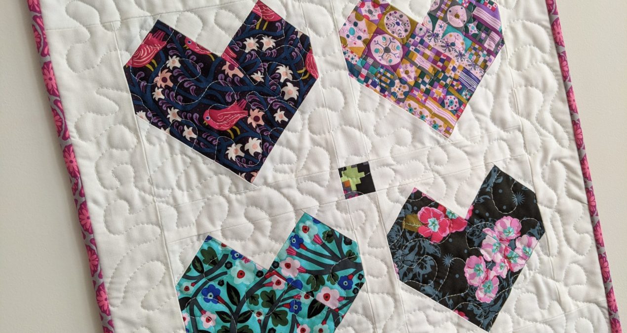 This mini is made of up four small heart blocks, along with some sashing and a border. It’s a very quick finish, and you get to learn my fun new way of assembling hearts while you’re at it! No special tools are required – just your normal ruler and a marking pen of some sort.